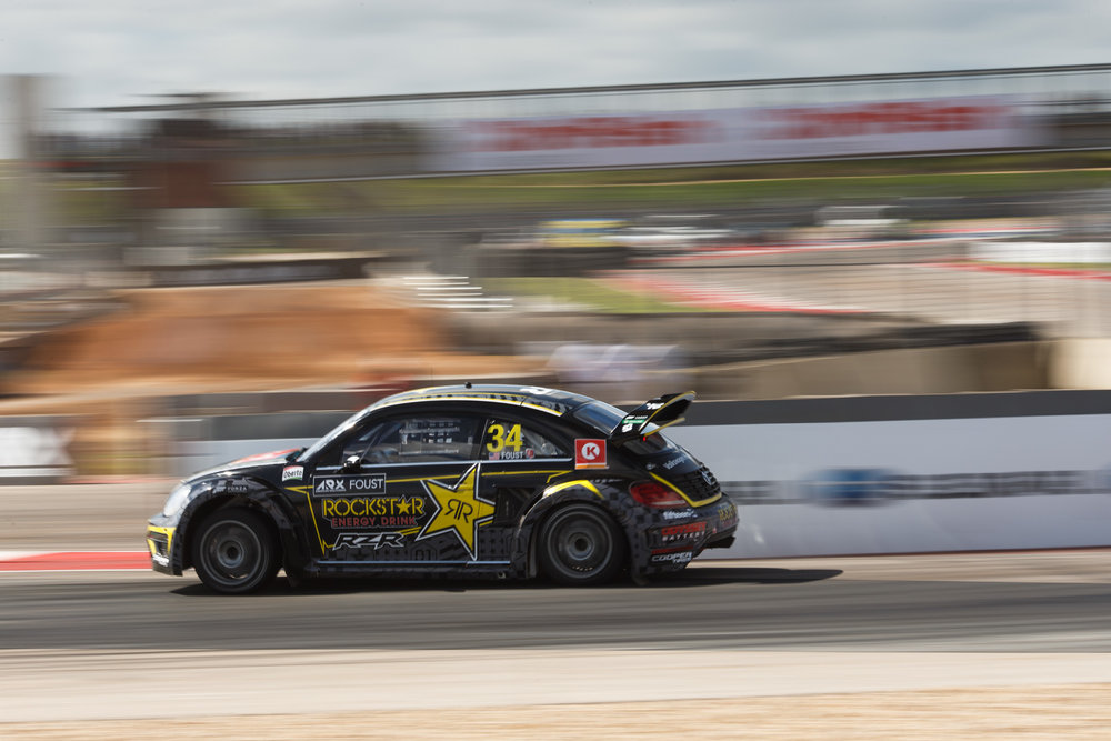 Tanner Foust completed a clean sweep of the first two qualifying rounds for the final round of the 2018 Americas Rallycross season at Circuit of the Americas, while team mate and title rival Scott Speed struggled to fifth place overall after both heats.